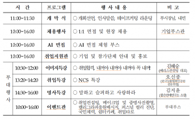 이밖에도, 구직자의 취업스킬과 면접능력 향상을 위해 NCS 기반 채용방법 소개 특강과 면접을 위한 이미지 연출 특강, 청년들의 열정을 북돋을 명사 특강과 취업컨설팅 등 부대행사도 알차게 마련된다.