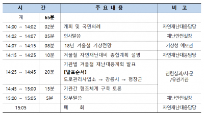 [충청뉴스큐] 강원도는 8일 교육청, 경찰청, 기상청 등 15개 유관기관과 도 협업부서 및 18개 시군이 참여한 가운데 겨울철 자연재난 사전대비 관계관 회의를 갖고 기관별 대응계획을 공유하고 재난발생시 기관간 협업체계 구축 방안을 논의했다.