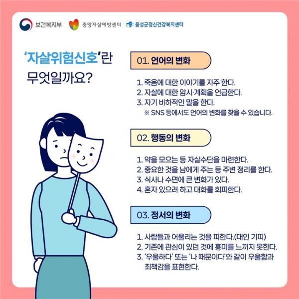 권태복 음성군 보건소장은 “자살 예방은 음성군민 모두가 함께 노력해야 될 숙제로 주변의 작은 관심과 배려가 예방에 큰 도움이 된다”며 “자살고위험군을 조기에 발견 할 수 있도록 사회적 안전망 조성을 위해 최선을 다 할 것이며 생명존중 문화 확산을 위해 주민들의 적극적인 동참을 당부드린다”고 말했다.