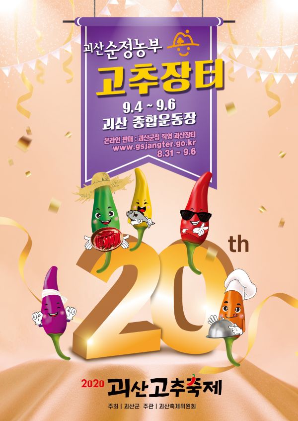 올해 20주년을 맞은 괴산고추축제는 신종 코로나바이러스 감염증 확산 여파로 준비했던 이벤트를 모두 취소하고 온라인으로 전면 전환해 8월 31일부터 9월 15일까지 16일간 열렸다.