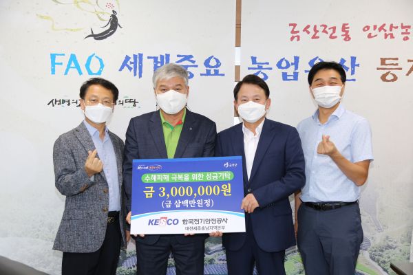 [충청뉴스큐] 한국전기안전공사 대전세종충남지역본부는 지난 15일 금산군청을 찾아 금산 수해피해 극복을 위한 성금 300만원을 기탁했다.