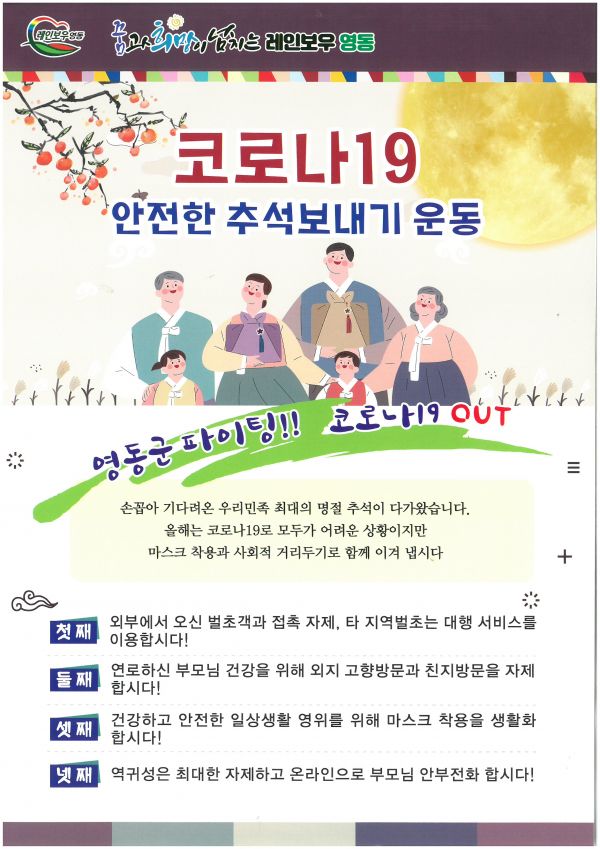 [충청뉴스큐] 충북 영동군이 민족 최대 명절인 추석을 앞두고 코로나19 예방을 위한 ‘코로나19 안전한 추석보내기 4대 수칙’을 발표했다.