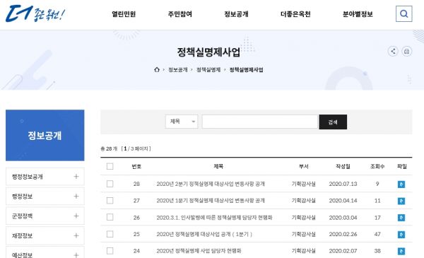 옥천군은 현재 총사업비 10억 이상의 건설 및 개발사업, 군비 1억원 이상 자체사업, 5천만원 이상의 연구·용역, 다수군민 관련 자치법규 제·개정, 국민신청실명제 사업의 선정기준에 따라 옥천군 정책 114건을 공개해 투명하게 운영하고 있다.