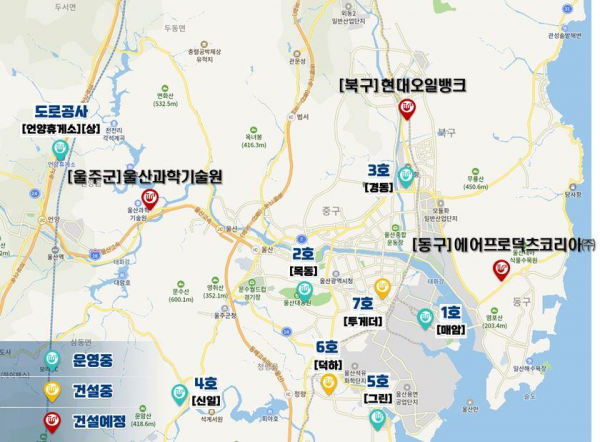 수소충전소 역시 전국에서 가장 많은 6개소로 전국 37개 수소충전소 중 16%가 울산에 있다.