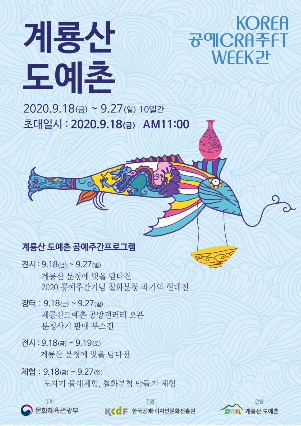 문화체육관광부가 주최하고 한국공예디자인문화진흥원이 주관하는 ‘2020 공예주간’은 ‘계룡산 분청에 맛과 멋을 담다’를 주제로 오는 27일까지 총 10일간 진행된다.