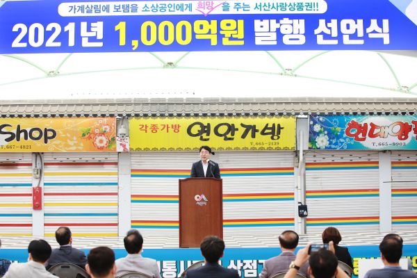 맹정호 서산시장은 21일 동부시장 내 쌈지공원에서 ‘2021년 서산사랑상품권 1,000억원 발행 선언식’을 개최했다.