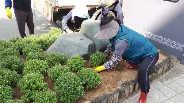 국화꽃 식재는 50여명의 기간제 ˑ 희망근로 ˑ 공공근로 인력이 소요되고 있다.