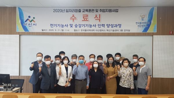 [충청뉴스큐] 아산시가 지난 21일 한국폴리텍Ⅳ대학 아산캠퍼스 혁신기술센터에서 ‘전기기능사 및 승강기기능사 양성과정’ 수료식을 가졌다.