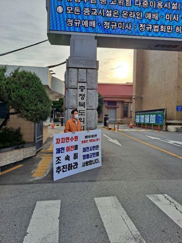 [충청뉴스큐] 충청북도 자치연수원의 조속한 제천시 이전을 요구하는 1인 릴레이 시위가 이어지고 있다.