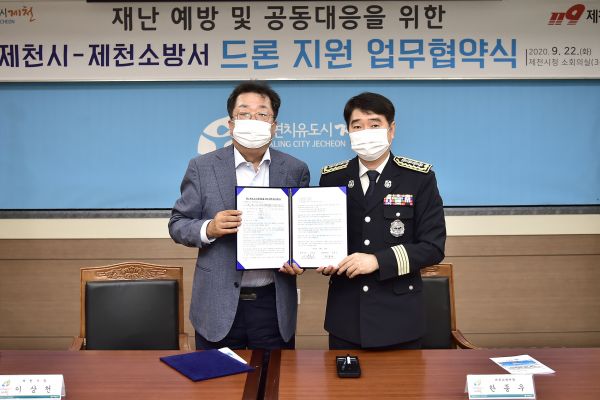[충청뉴스큐] 제천시는 지난 22일 시청 소회의실에서 제천소방서와 재난예방 및 공동대응을 위한 드론 지원 업무협약을 체결했다.