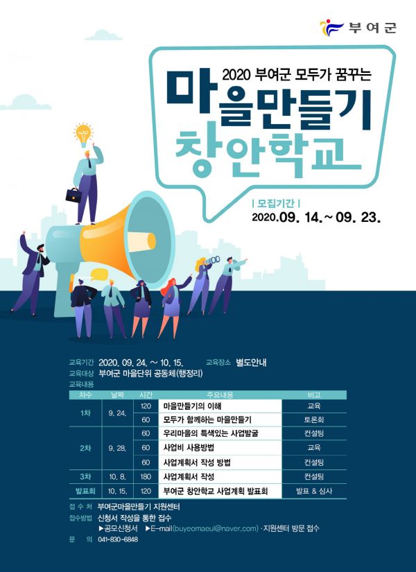 교육 신청자는 9월 24일부터 10월 15일까지 총 4회에 걸쳐 사업 발굴 요령 및 사업계획서 작성 방법 등을 학습한 후 사업계획서 발표회에 참가해야 하며 발표회를 통해 선정된 우수 창안에 대해서 부여군은 총 5천만원의 사업비를 지원할 예정이다.