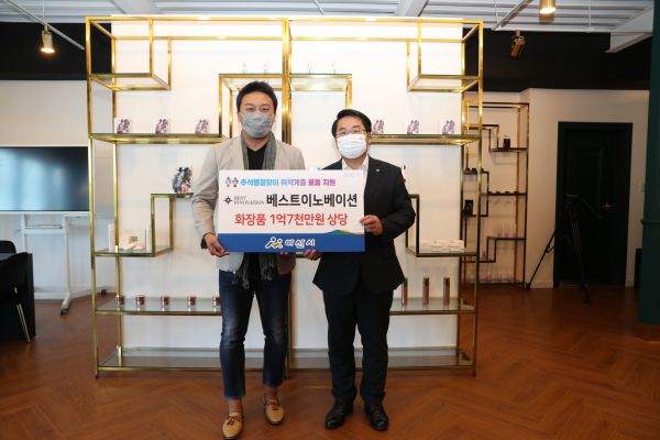 [충청뉴스큐] ㈜베스트이노베이션이 관내 사회복지시설 및 취약계층을 위해 23일 아산시에 1억7,000만원 상당 자체 브랜드 화장품을 전달했다.