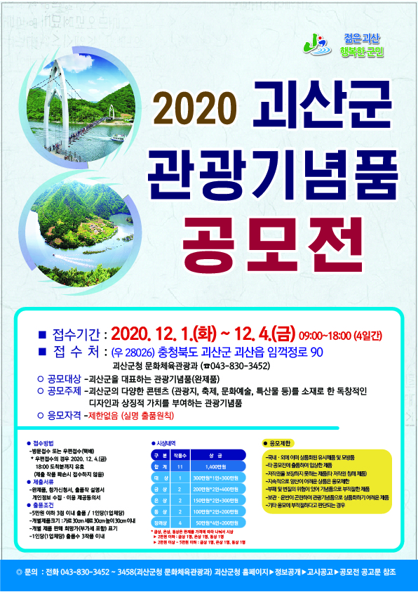 괴산군 관계자는 “이번 공모전은 개인과 업체의 기념품 개발 의욕을 고취시키는 계기가 될 것”이라며 “괴산을 상징하는 실용적이고 우수한 관광기념품이 많이 출품되길 바란다”고 말했다.