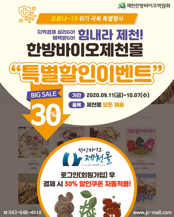 이번 특별할인 이벤트는 제천한방바이오박람회 연계사업으로 9월 11일부터 10월 7일까지 한방바이오 제천몰의 모든 제품에 대해서 최소 30%에서 최대 70%까지 파격적인 할인 혜택으로 우수한 한방제품을 만나볼 수 있다.
