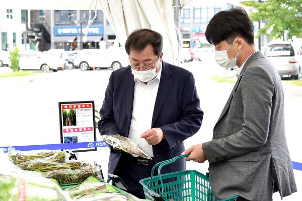 [충청뉴스큐] 이상천 제천시장은 지난 25일 추석 명절을 앞두고 제천로컬푸드 직거래장터를 찾아 농산물을 구입하며 장바구니 물가를 몸소 체험하고 행사를 운영 중인 제천로컬푸드협동조합 김현주 조합장과 농가들을 격려했다.