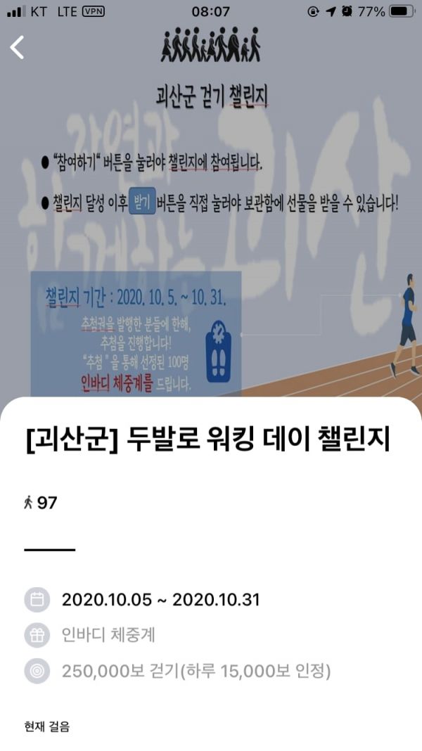 괴산군 공식 커뮤니티에 가입해야만 걷기 챌린지 화면이 보이며 하루 최대 적립 걸음 수는 1만 5천보로 제한된다.