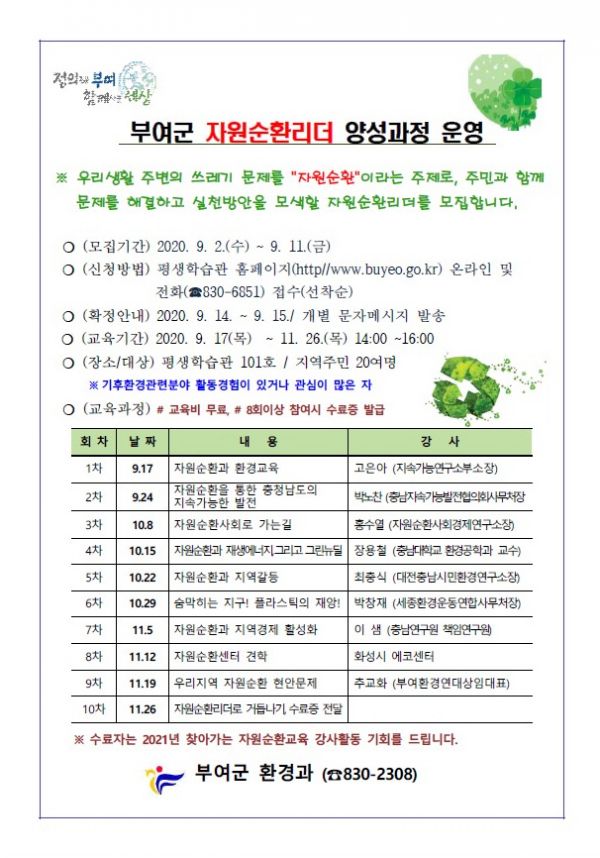 [충청뉴스큐] 부여군은 지난 9월 17일부터 11월 26일까지 일상 속에서 주민들과 함께 재활용 문제에 대해 고민하고 자원순환문화를 조성하기 위해 ‘자원순환리더’를 양성 운영한다고 밝혔다.