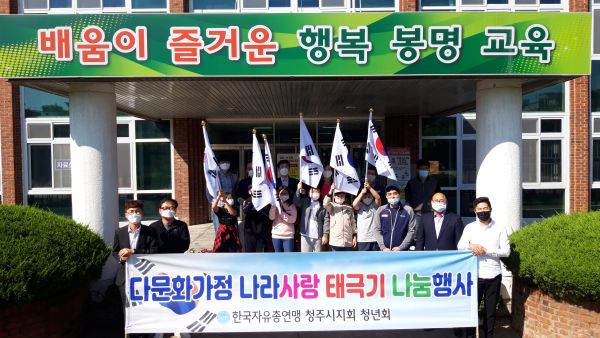[충청뉴스큐] 한국자유총연맹 청주시지회 청년회가 6일 흥덕구 소재 봉명초등학교에 다문화가정 재학생 148명 전원에게 지급할 수 있도록 100여만원 상당의 가정용 태극기 150개를 구입해 전달했다.