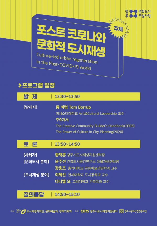 문화도시센터와 청주시도시재생지원센터는 “코로나19 탓에 오프라인으로 심포지엄을 진행하지 못하게 된 것은 아쉽지만 시간과 공간의 제약이 없는 웹포지엄의 장점 덕분에 오히려 글로벌한 논의의 장을 마련할 수 있었다”며“문화와 예술로써 지역을 더 매력적이고 이용자 친화적으로 디자인할 수 있다고 말한 버럽 교수가 청주의 문화적 도시재생에 어떤 메시지와 이정표를 제시할지 주목된다”고 전했다.