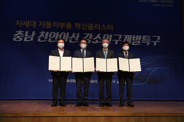 충청남도와 아산시, 천안시, 한국자동차연구원은 지난 7월 27일 ‘충남 천안아산 강소연구개발특구’로 지정됨에 따라 강소연구개발특구의 비전을 대내외에 선포해 아산·천안지역이 미래자동차 산업을 선도하는 허브로써의 위상을 확립하고자 비전선포식을 개최하고 협약기관 협력사항에 대한 ‘강소특구 행정협의회 협약’을 체결했다.