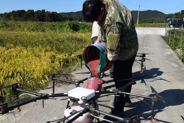 최근에는 파종 방법도 다양해지고 있는데 관행적으로 하고 있는 미스트기를 이용하는 경우 작업량은 일 2ha인 반면, 드론은 20ha, 무인헬기는 32ha를 하루에 파종할 수 있어 높은 작업 효율을 나타낸다.