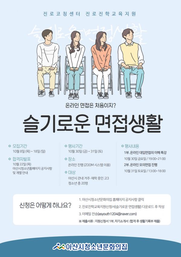 [충청뉴스큐] 아산시청소년문화의집이 진로코칭센터사업 일환으로 진로진학교육지원 ‘슬기로운 면접생활’ 온라인 대입면접 특강 및 1:1 모의면접을 추진한다.