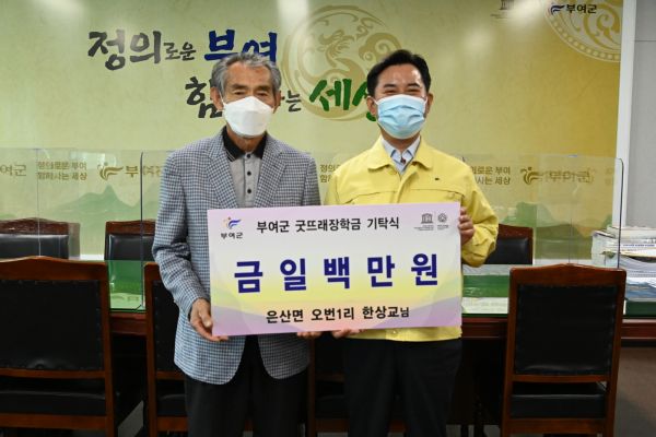 [충청뉴스큐] 지난 12일 은산면 오번1리 한상교 이장이 부여군청을 방문해 100만원의 굿뜨래 장학금을 전달했다.