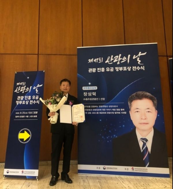 [충청뉴스큐] 단양군은 ‘제47회 관광의 날’을 기념해 밀레니엄 힐튼 서울 그랜드볼룸에서 진행된 관광진흥유공 정부포상 전수식에서 단양 제비호 선장 장상덕 씨가 국무총리 표창을 수상했다고 지난 14일 밝혔다.