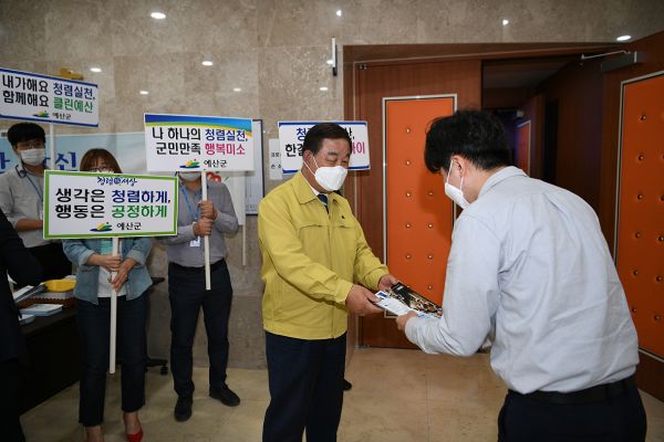 [충청뉴스큐] 예산군은 지난 13일 군청 추사홀에서 진행된 10월 월례조회에서 청렴문화 확산을 위한 ‘청탁금지법’ 등 홍보 캠페인을 전개했다.