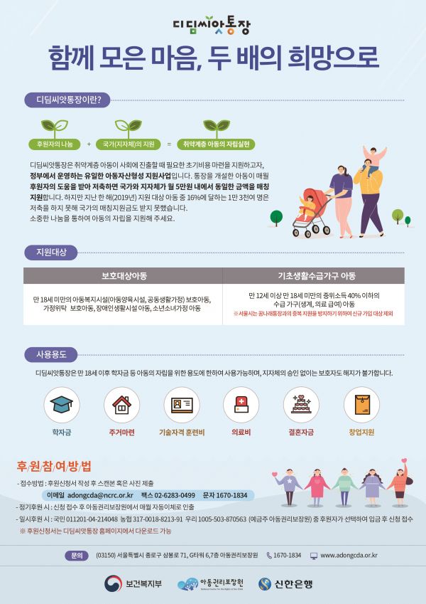 후원 신청은 디딤씨앗통장 인터넷 홈페이지 또는 전화로 하면 된다.