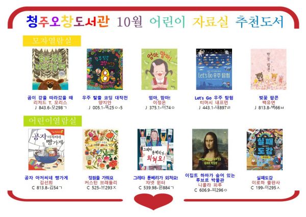[충청뉴스큐] 청주오창도서관이 아동을 대상으로 한 이달의 추천도서로‘청렴도서’1권과‘아동 신간도서’9권을 포함한 총 10권을 선정했다.