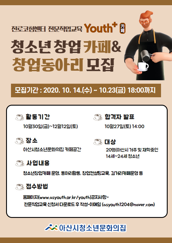 [충청뉴스큐] 아산시청소년문화의집은 오는 23일까지 청소년창업카페를 운영할 청소년창업동아리를 모집한다.