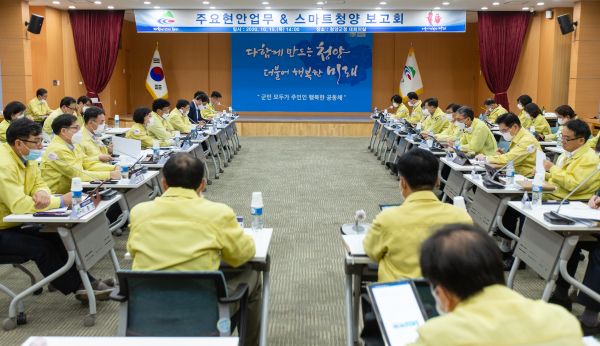 김돈곤 군수와 실과장, 주무팀장 등이 함께한 보고회에서는 부서별 역점사업 관리상황 보고 효율적 운영방안 강구 순으로 진행됐다.