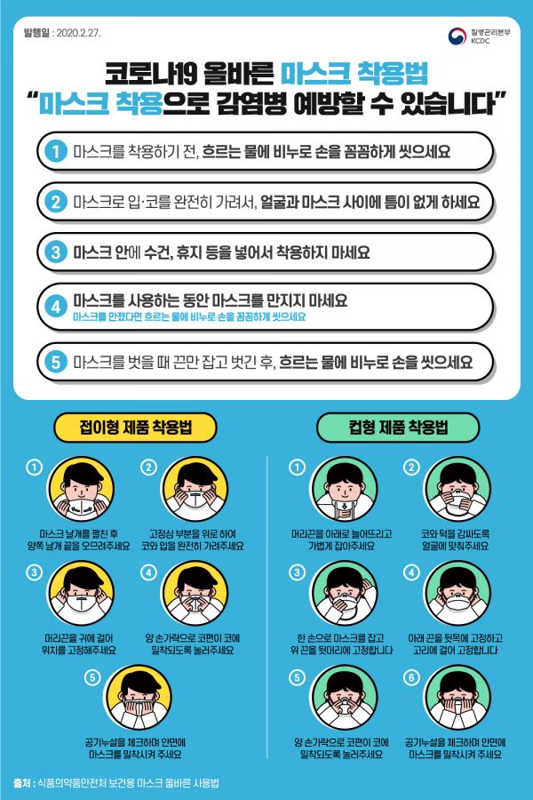 착용 가능한 마스크 종류로는 보건용 마스크, 비말차단용 마스크, 수술용 마스크, 입과 코를 가릴 수 있는 천 마스크, 일회용 마스크로 망사형 마스크, 벨브형 마스크, 스카프 등 옷가지로 얼굴을 가리는 것은 허용되지 않는다.