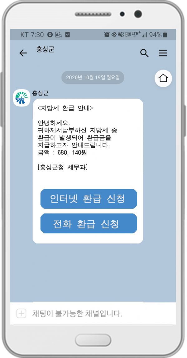 특히 홍성군 세톡 서비스는 기존의 카카오톡 플러스 친구로 등록된 주민에게만 지방세 안내 메시지를 전달했던 것과 달리 전국 최초로 지방세 환급대상자에게 직접 환급안내 및 환급신청을 할 수 있도록 안내 메시지를 전달하는 등 주민맞춤형 납세서비스를 제공할 예정이다.
