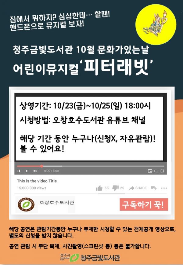 [충청뉴스큐] 청주금빛도서관이 10월 문화가 있는 날 행사로 어린이 온라인 뮤지컬 ‘피터래빗’을 상영한다.
