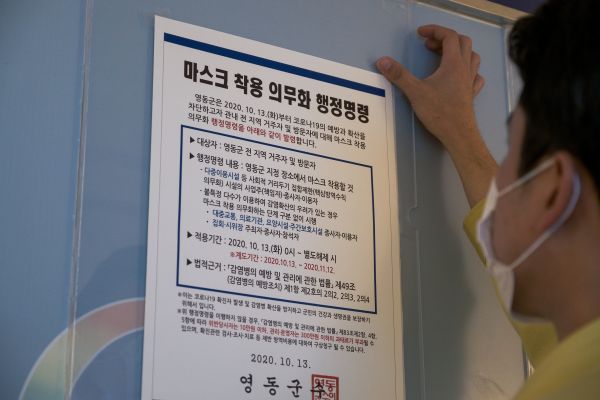 [충청뉴스큐] 충북 영동군이 전 지역 거주자 및 방문자에 대해 지난 마스크 착용 의무화 행정명령을 발령했다고 밝혔다.