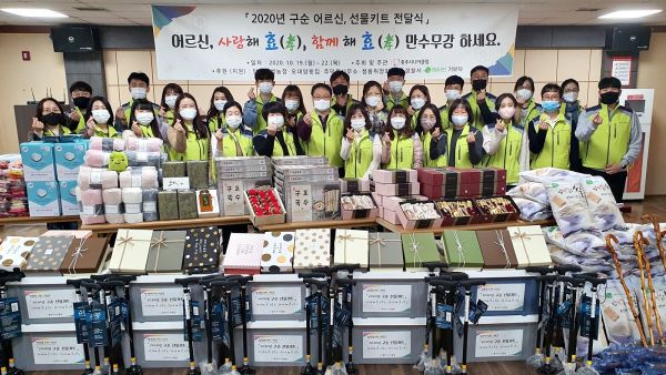 ‘사랑해 효, 함께 해 효 만수무강하세요.’를 주제로 열린 올해 행사는 코로나19 예방을 위해 기존에 한자리에 모여 ‘구순 잔치’를 열던 방식에서 최소한의 인원이 노인 가정을 가가호호 방문해 선물 키트를 전달하신 것으로 변경됐다.