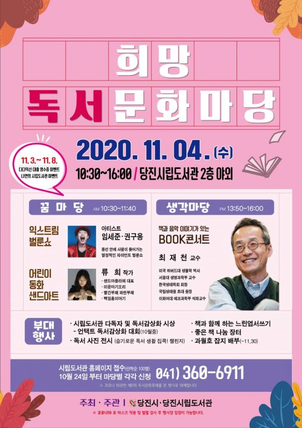 [충청뉴스큐] 계절이 바뀌는 길목에서 당진시립도서관이 오는 11월 4일 ‘희망독서문화마당’을 개최한다.