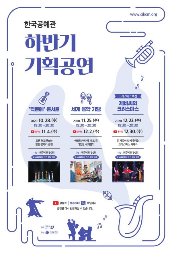세계음악기행, 크리스마스 특집 등 다양한 무대가 펼쳐질 예정으로 공연영상은 매회 행사가 끝나고 일주일 뒤 공예관 유튜브 채널을 통해 다시 시청할 수 있다.