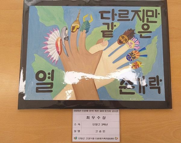 ‘포스터’부문에서는 ‘다르지만 같은 손가락’으로 고승민학생이 최우수상으로 선정됐으며 표어부문으로는 ‘차별 없는 문화존중 만들어요 행복사회’로 류서후 학생과 ‘다문화가족 다르지 않아요’ 권민서 학생이 포스터부문 우수상으로 선정됐다.