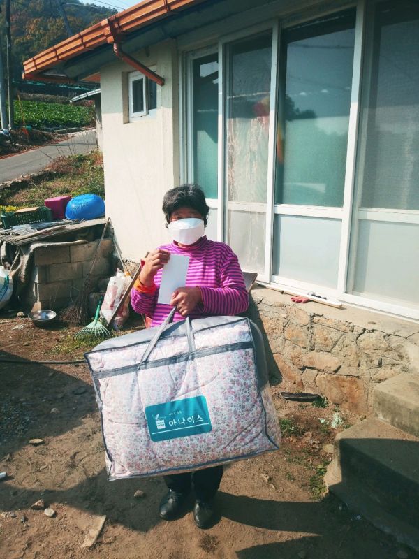미선회는 생산적 일손봉사로 마련한 기금으로 소수면에 거주하는 취약계층 가구를 방문해 괴산사랑상품권 20만원과 이불세트를 전달했다.