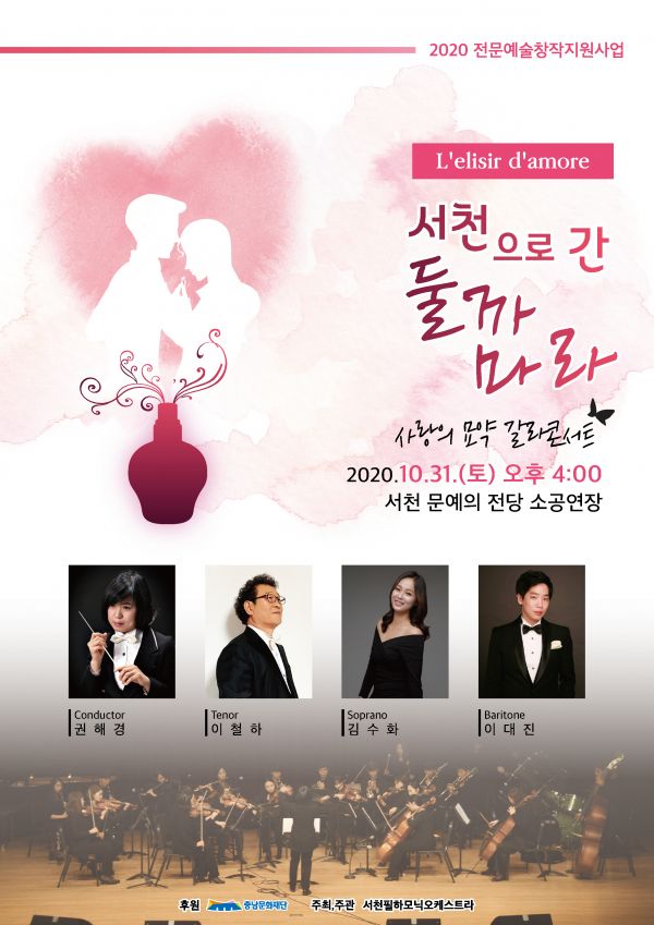 서천필하모닉오케스트라의 연주와 함께 테너 이철하, 소프라노 김수화, 바리톤 이대진의 출연하며 사랑의 묘약 중 ‘남몰래 흐르는 눈물’ 등의 곡을 선보일 예정이다.