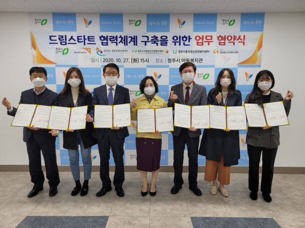 [충청뉴스큐] 청주시가 27일 오후 청주시 아동복지관에서 충청북도발달장애인지원센터, 월드비전 용암종합사회복지관, 청주시 서원·훙덕·청원정신건강복지센터 등 5개 기관과 드림스타트 협력체계 구축을 위한 업무협약을 체결했다.
