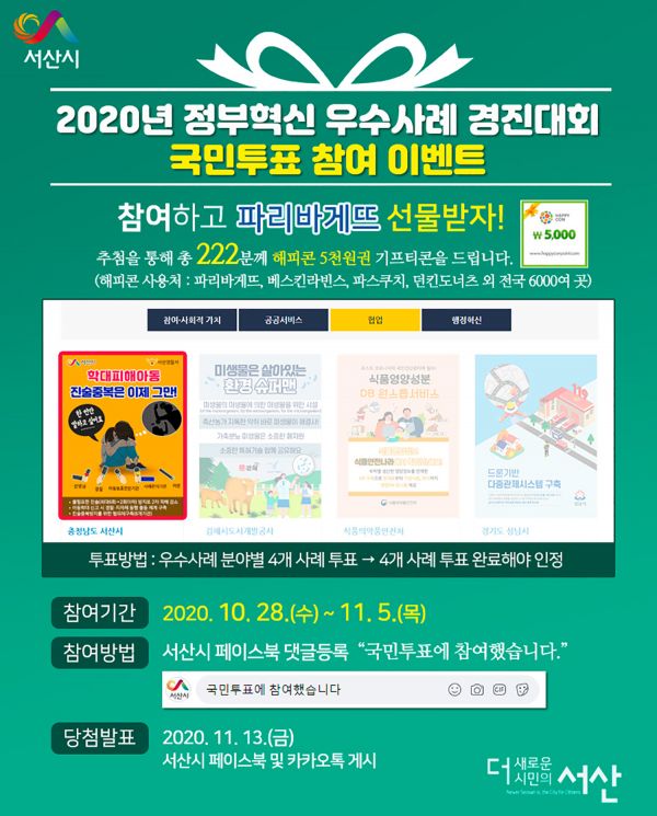 특히 투표 참여 후 ‘서산시 페이스북’에 인증하면 추첨을 통해 소정의 상품도 지급한다.