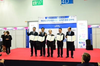 특히 이날 행사에는 ‘일자리 잡고 부산에서 살자’라는 슬로건 아래 지역 일자리창출과 고용률 향상을 위해 오거돈 부산시장, BNK금융그룹 회장, 동의과학대학교, 선보공업, 부산광역시 맞춤훈련협의회장 등 부산시 산·학·관·기업·단체가 하나로 힘을 모으는 ‘부산시 시책사업을 통한 일자리창출 업무협약’을 체결했다.