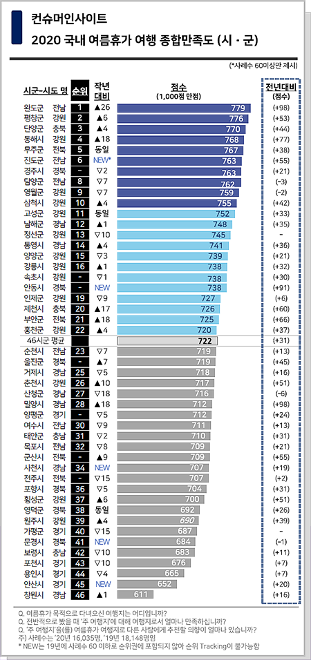 [충청뉴스큐] 여론조사기관 “컨슈머인사이트”가 발표한 “2020년 국내 여름휴가 여행 종합만족도” 리포트에서 제천시의 여행 만족도가 크게 상승 한 것으로 조사됐다.