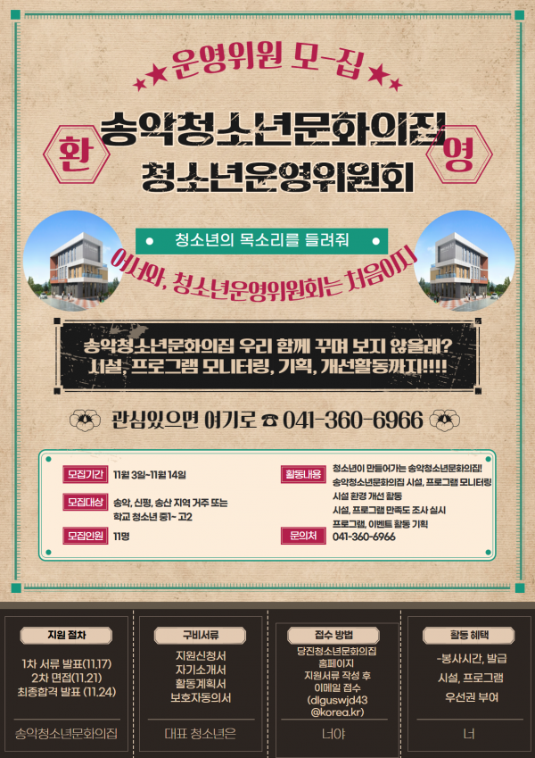[충청뉴스큐] 당진시가 이달 중 개관 예정인 송악청소년문화의집 청소년운영위원회 신규위원을 오는 14일까지 모집한다.