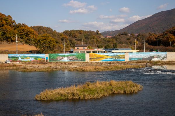군은 산막이옛길 초입의 칠성면 외사리 수전교 일원에 폭 6미터, 길이 95미터 규모의 대형 벽화를 그렸다고 4일 밝혔다.