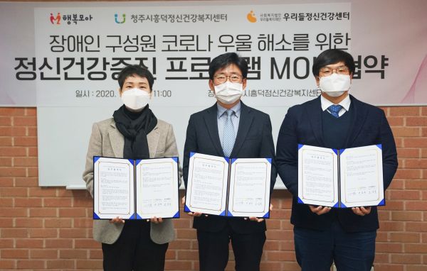 [충청뉴스큐] 청주시흥덕정신건강복지센터가 4일 행복모아와 우리들정신건강센터와 함께 행복모아 장애인 구성원의 코로나우울 극복을 위한 정신건강증진 프로그램 업무협약을 체결했다.